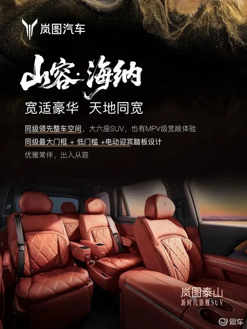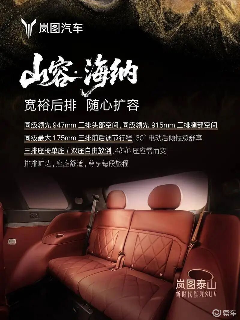 据官方介绍,岚图泰山拥有1070mm前排头部空间,前排乘坐宽度达1494mm。二排大四座模式下的膝部空间达240mm,二排头部空间达1100mm,二排中央通道宽度达180mm。此外,新车三排头部空间达947mm,三排腿部空间达915mm。三排前后调节行程达175mm。同时,新车三排座椅支持单座/双座自由放倒。