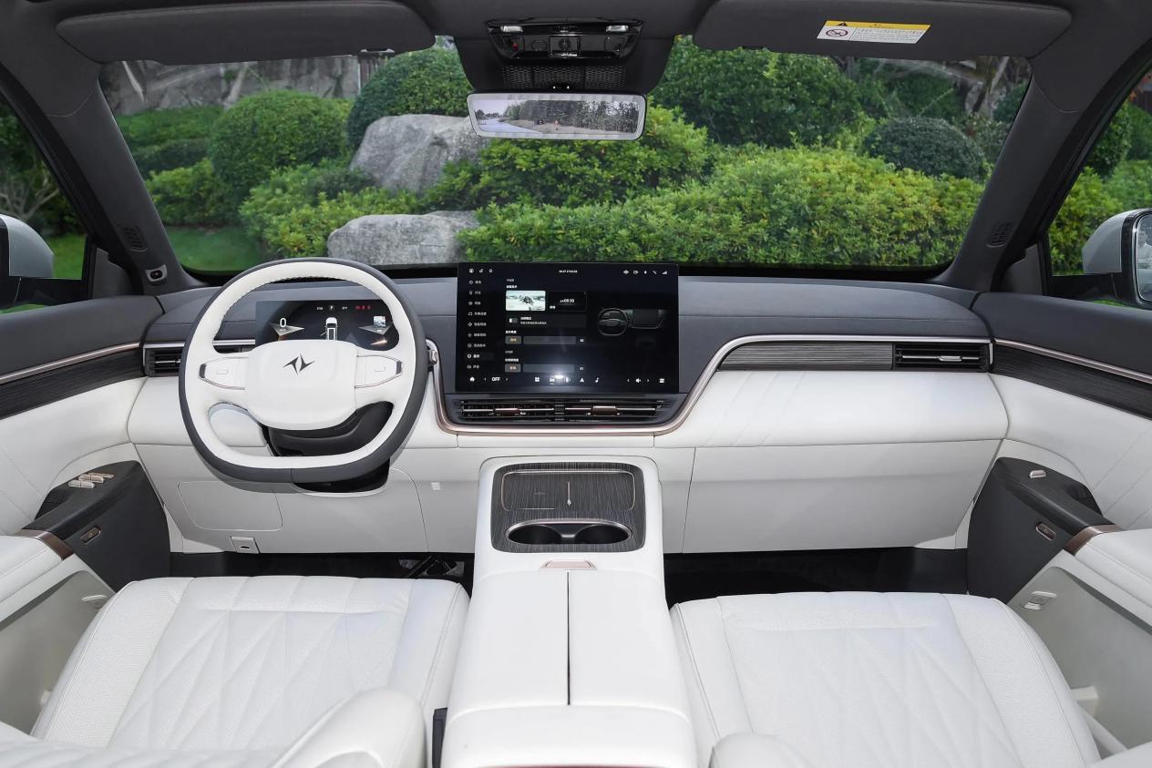 内饰设计中规中矩,不算出彩,但也没什么毛病,简约的内饰布局,看上去还是比较清爽的,配备D型双辐式多功能方向盘、10.25英寸液晶仪表、15.6英寸悬浮式中控屏,另外车型还标配了流媒体后视镜和15.6英寸2.5K分辨率的后排吸顶娱乐屏。