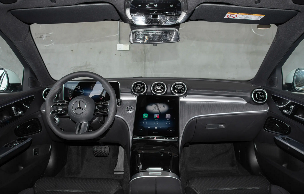 进入2026款奔驰C级的座舱,该款车的中控台通过软皮、木纹饰板以及金属饰条等元素组合而成,高级感有效凸显。12.3英寸仪表盘与11.9英寸触控屏共同组成车辆智能化部分,内置MBUX车机系统,UI界面炫酷,配合64色氛围灯,进一步提升了座舱豪华感。该屏幕拥有卫星导航、语音交互等实用性功能,基本贴合主流用户的使用需求。值得一提的是,奔驰C级的屏幕下方还集成了多个触控快捷键,免去了多级查找的困扰,便捷程度相对较好。平底式方向盘采用真皮包裹,支持四向调节功能,以便不同身材驾驶员找到适合自己的驾驶姿势。