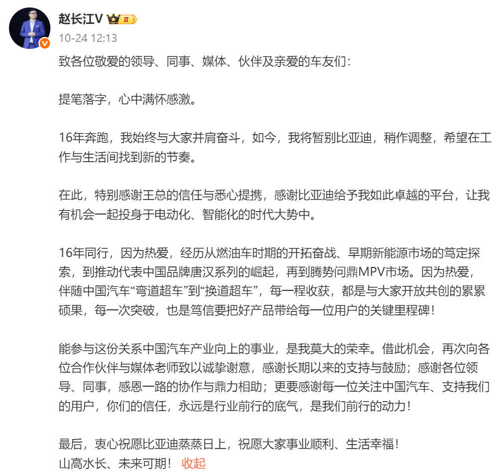 10月24日,腾势方程豹直营事业部总经理赵长江在其个人社交媒体上发文确认离职。他表示,“将暂别比亚迪,稍作调整,希望在工作与生活间找到新的节奏。”