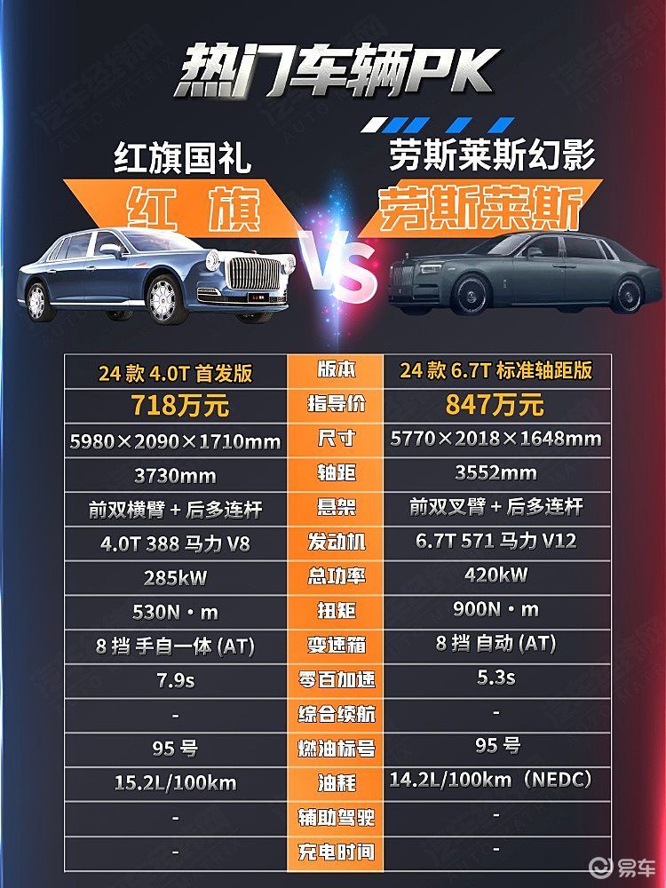 我们将以2024款劳斯莱斯幻影6.7T标准轴距版(847万) 红旗国礼2024款4.0T V8标准版(718万)为例,看看谁更符合你心目中“有钱人玩具”的定位。